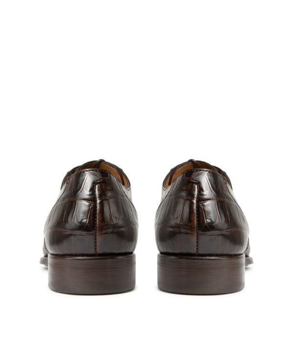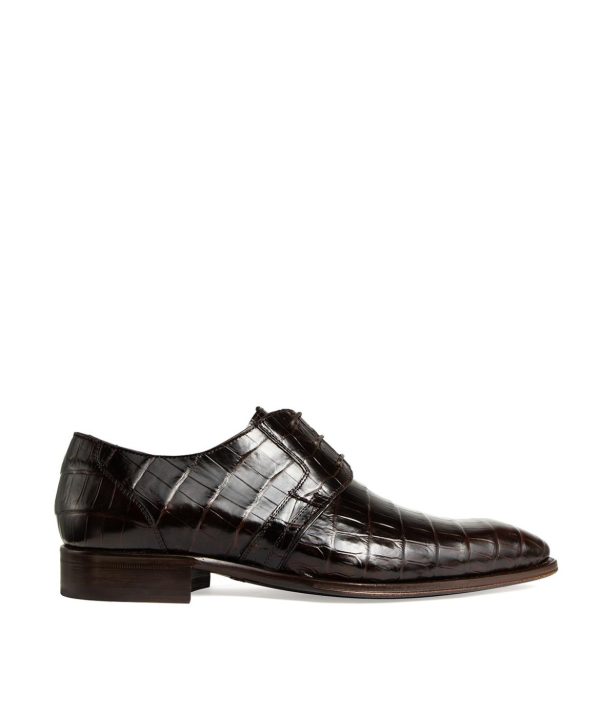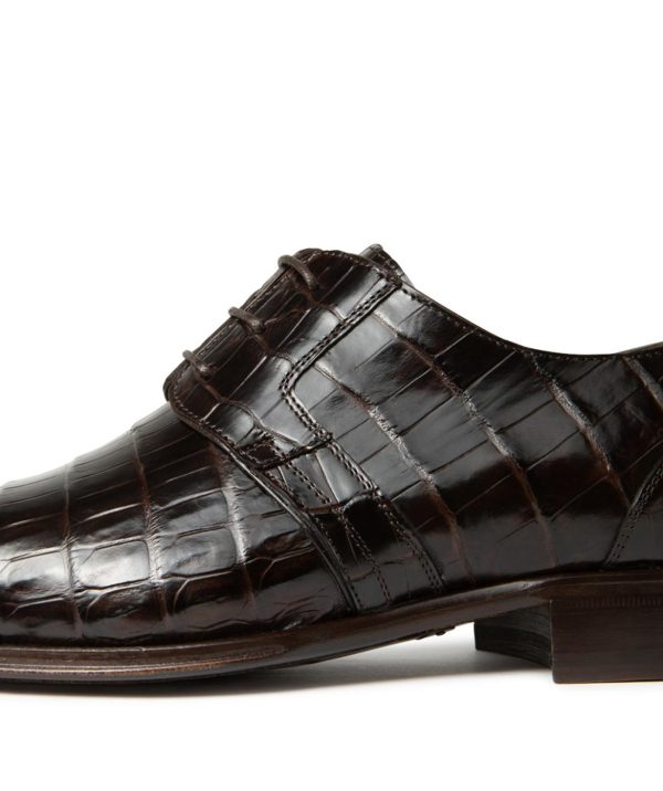 Souliers Derby 3 oeillets en crocodile Niloticus véritable, cousu Blake, semelle patinée à la main. Série limitée à 100 exemplaires seulement. Les souliers Onyx ont une esthétique atypique et sont exclusifs par la qualité exceptionnelle de sa peausserie.